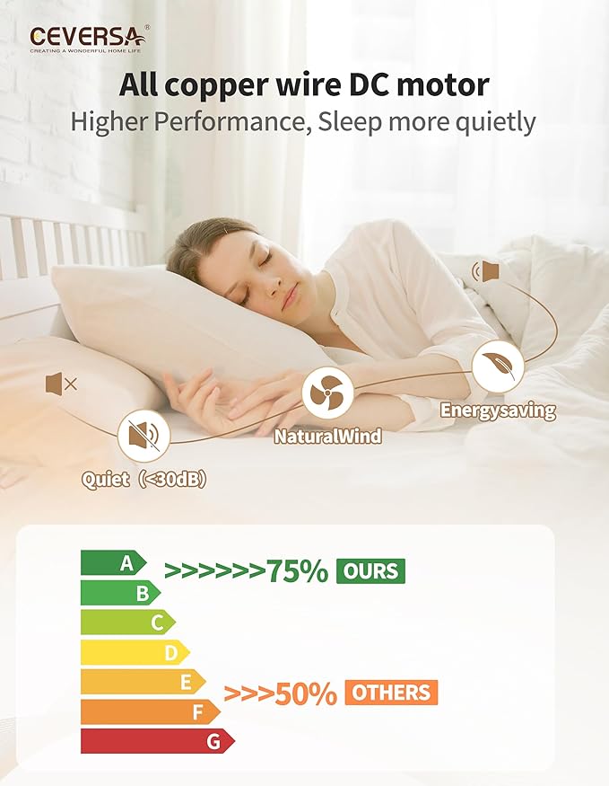 - 【Noiseless Reversible DC Motor】Ceversa ceiling fan with light use solid copper wires, which have superior conductivity compared to traditional AC motors. This enhances motor efficiency by over 50%, significantly reducing energy consumption and saving on electricity bills. With noise levels below 30 decibels, our motors are designed to last for over 15 years.