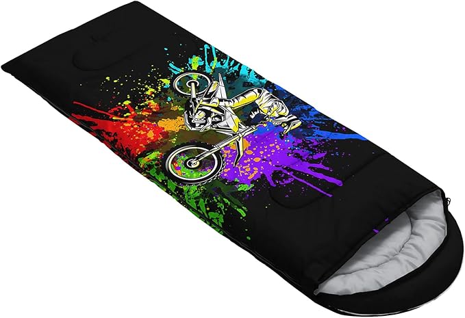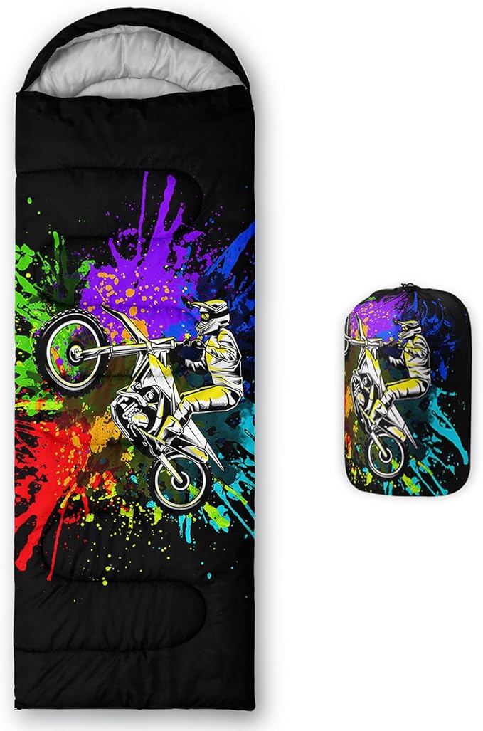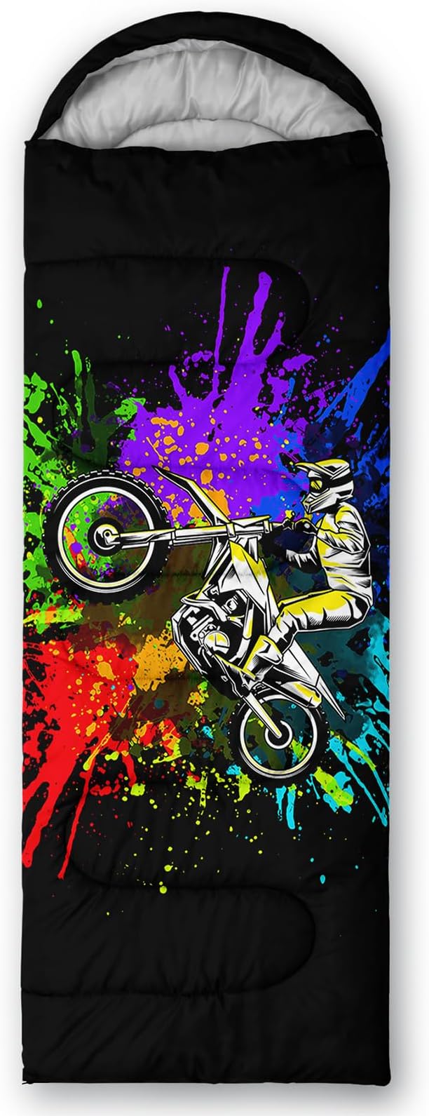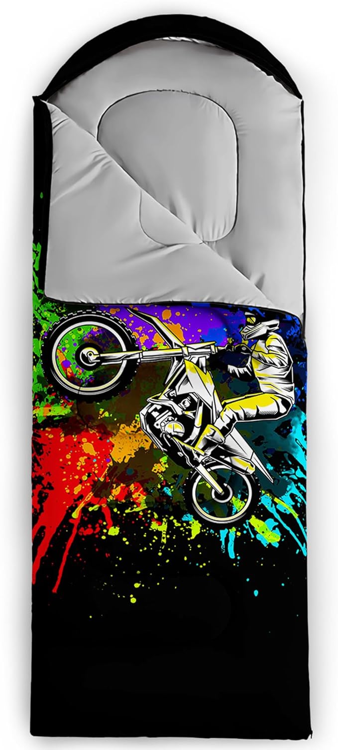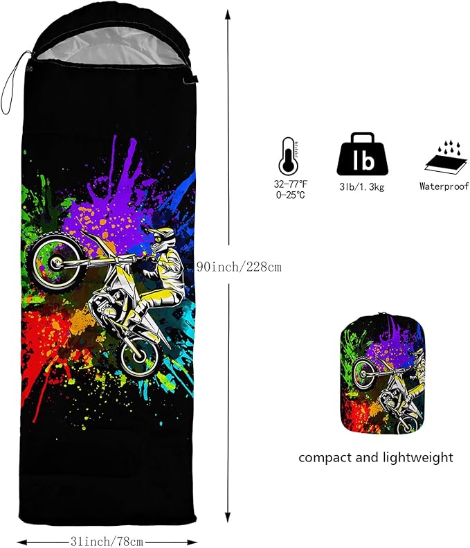 - 【Fits For 3 Seasons】: Size - 31 by 90 inches (W x D). Our Tie Dye Motocross sleeping bag can be used in 3 seasons with a design temperature of 32℉-77℉(0℃-25℃). These Sleeping bags also have a weather resistant waterproof design to keep you warm and prevent you from any dampness.