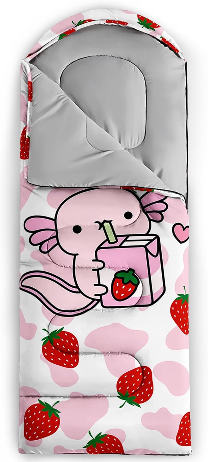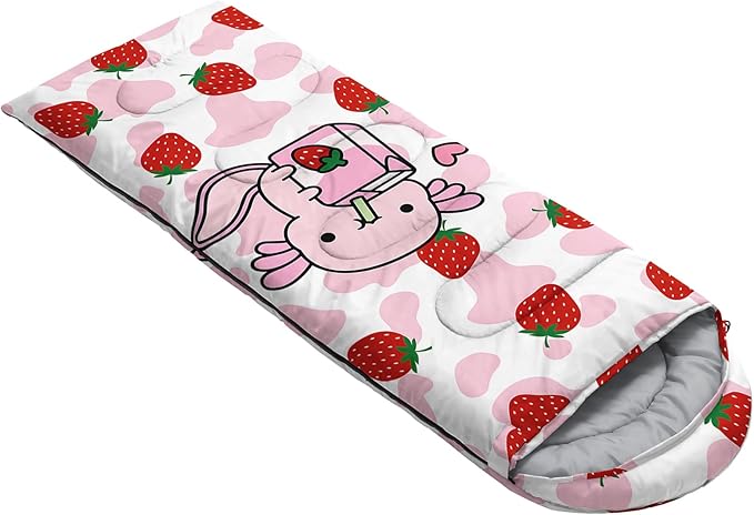 - 【Fits For 3 Seasons】: Size - 31 by 90 inches (W x D). Our Strawberry Axolotl sleeping bag can be used in 3 seasons with a design temperature of 32℉-77℉(0℃-25℃). These Sleeping bags also have a weather resistant waterproof design to keep you warm and prevent you from any dampness.