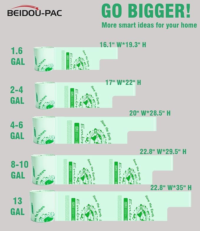 - [KITCHEN COMPOST BIN COMPATIBLE] -- BEIDOU-PAC Compostable Bags, 4-6 gallon 20" x 28.5" x 0.7 mils, 75 Count (Pack of 2), home compostable and biodegradable are compatible with a backyard compost system. Our compost trash bags can perfect for 4, 5, 6 gallon under-the-sink kitchen trash can.
