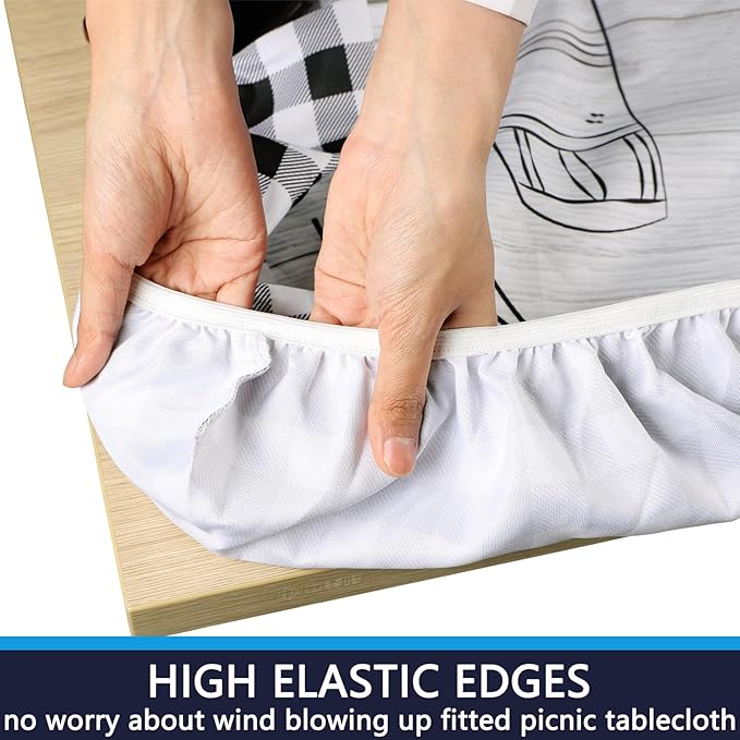 - 【Fitted Picnic Table Cover and Bench Covers】- Our picnic table covers with elastic are specially designed for outdoor use to avoid the wind flowing away this camping tablecloth. All sided is elastic band for securely fitted. No Clips Needed.