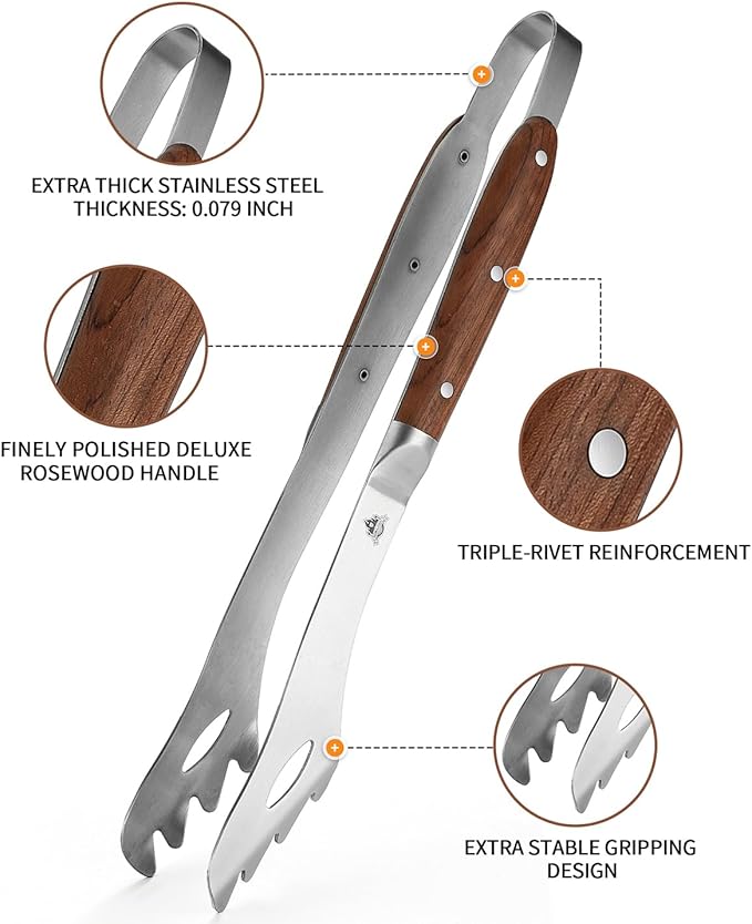 - PREMIUM QUALITY AND DURABLE - Made of extra thick food-grade high quality stainless steel and premium rosewood with excellent production process. Smooth surface, no burrs, no sharp edges, safe to use. Engineered for a long life of reliable use. GRILLGEN Grill Tongs is a must-have for every griller, and will be your trusted grilling companion for years.