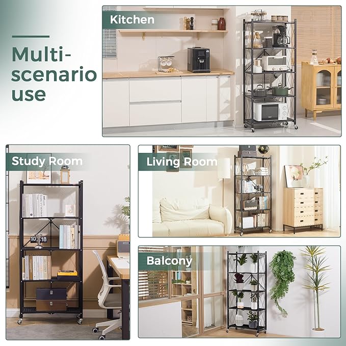 DEANIC 5-Shelf Folding Bookcase with Wheels, Rolling Bookshelf Heavy Duty Storage Shelves, Freestanding Metal Wire Shelving Unit for Living Room, Office, Kitchen, Basement, Pantry (Black)