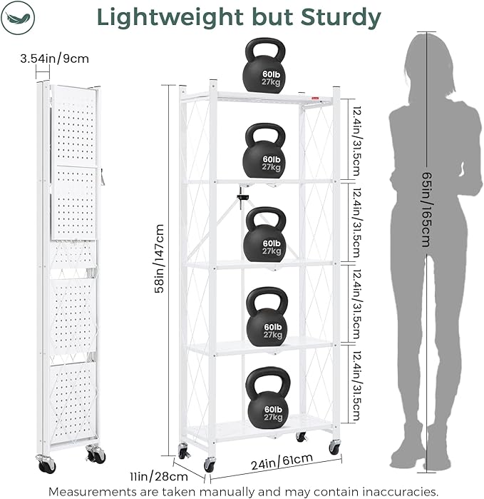 - [Perfect Size] Open size(with wheels): 24 x 11 x 58" The height on each layer not only creat more additional space but also keep your home clean and orderly. Folded size(with wheels): 3.54 x 11x 58". The storage rack can be stored under bed, behind doorways and so on, It will not take up more space when not in use.