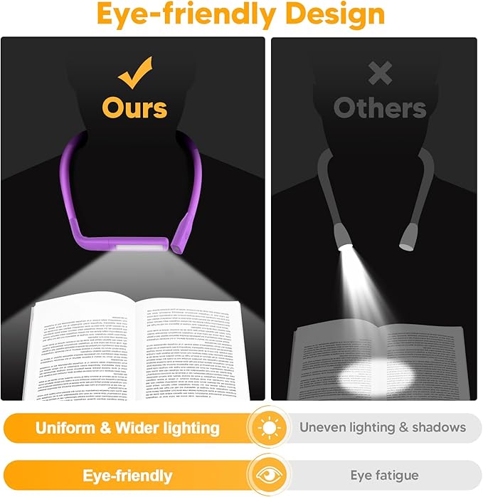 - Upgraded Eye-friendly Design --- Say goodbye to eye strain and discomfort with our rectangle book light. Unlike other brands' neck lights that feature small round spotlights creating uneven lighting and shadows, our neck light features a wide LED panel similar to a desk lamp that delivers uniform and soft illumination on your pages, taking care of your eyes while providing optimal reading conditions. Don't let poor lighting hinder your hobbies or relaxation time. Try our eye-friendly necklight