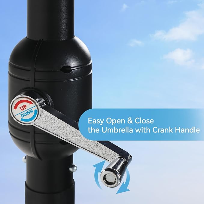 - EASY TO OPEN & CLOSE: The patio table umbrella features with an improved crank handle. Making it easy to open and close for children and the elderly, can be set up in just 30 seconds. TIPS: Please take down the outdoor umbrella during strong wind or rainy days.