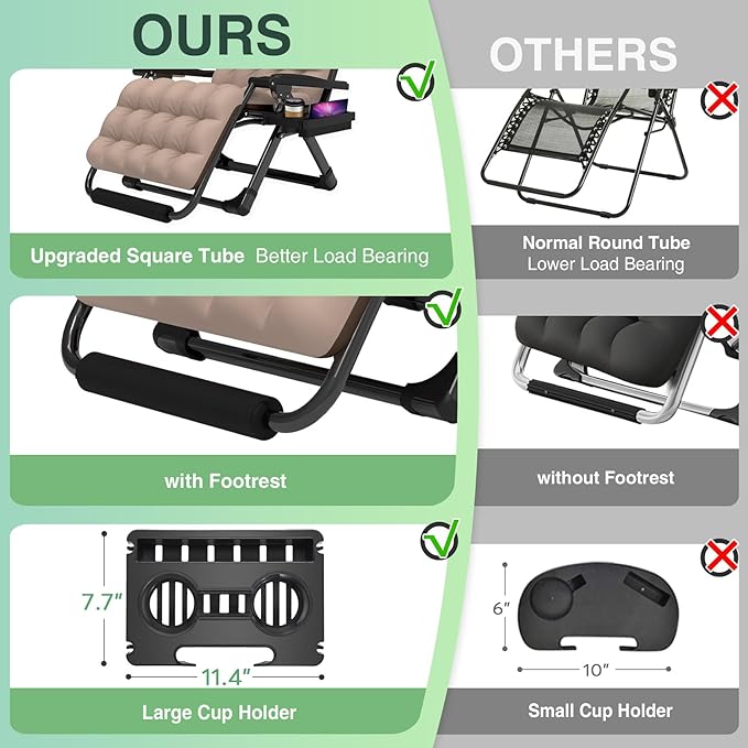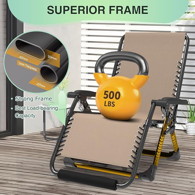 - 【Premium Material & Max Weight Capacity of 500LBS】The upgraded oversized zero gravity chair is designed to withstand up to 500 pounds. The 40mm (1.6 inches) thick steel tubing ensures that the chair remains stable and wobble-free, enhancing its load-bearing capacity and durability, especially suitable for outdoor patio use. The upgraded texlin fabric, double elastic straps, breathable mesh, and removable cushions provide additional comfort
