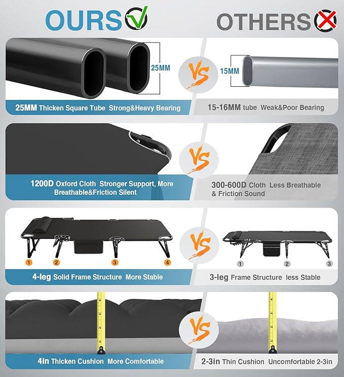 - 【Premium Material】The folding camping bed cot is made of 22mm square anti-rust steel frame, durable 1mm thickness tubing and premium sun-resistant 1200D Oxford cloth. It is more durable than ordinary materials and has stronger support. It also uses L-shaped non-slip foot pads to ensure stability and make you sleep more comfortably