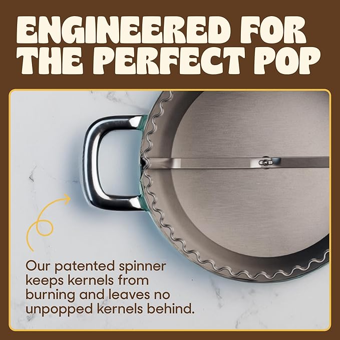 - QUALITY CRAFTMANSHIP - The Popsmith Popper’s stainless steel body, multi-layered metal bottom, and patented spinner all work together to prevent burnt and unpopped kernels.