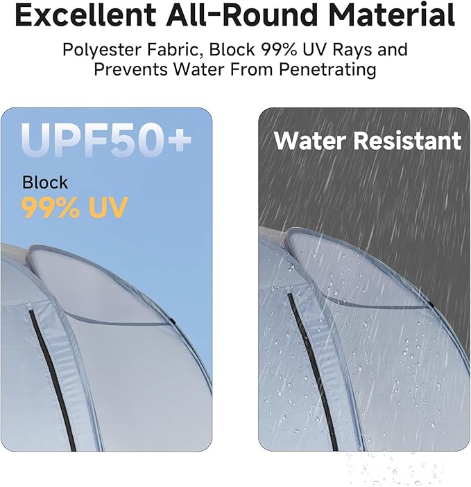 - Advanced UV Protection: Enjoy continuous UPF 50+ sun protection under our patented fabric top, designed to shield you from harmful UV rays. While offering exceptional sun protection, please note the tent is not waterproof or rainproof, ensuring it's used in appropriate weather conditions.