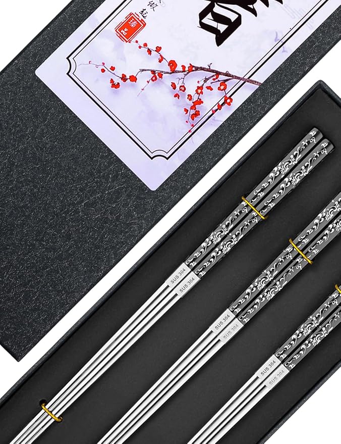 - PRETTY PRESENT: 3 pairs metal chopsticks in a awesome present package. Elegant pattern and craftsmanship chopsticks is a great present or household use, everyone will happy to get them and get compliments every where they go