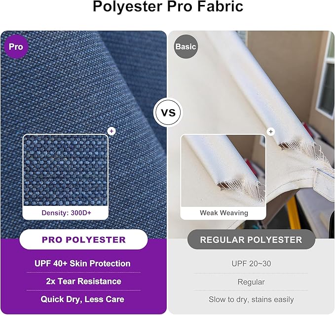 - Premium Polyester Pro Canopy - Features 2X tear-resistant fabric with 3 years fade resistance, quick-drying and easy to clean. Withstands sun, rain and wind while resisting wrinkles and shrinkage for lasting durability.