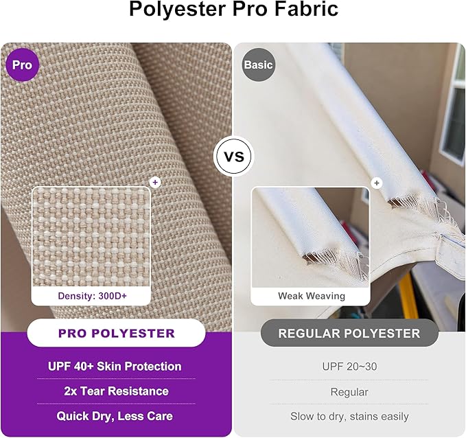 - Premium Polyester Pro Canopy: Features 2X tear-resistant fabric with 3 years fade resistance, quick-drying and easy to clean. Withstands sun, rain and wind while resisting wrinkles and shrinkage for lasting durability.