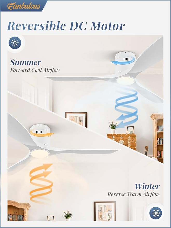 - DC MOTOR TECHNOLOGY: The Fanbulous ceiling fans operates with energy savings,powered by advanced reversible DC motor technology.In the summer, bask in the cool breeze as the fan's forward airflow. Come winter, engage the reverse function to ensuring a cozy and evenly heated space.