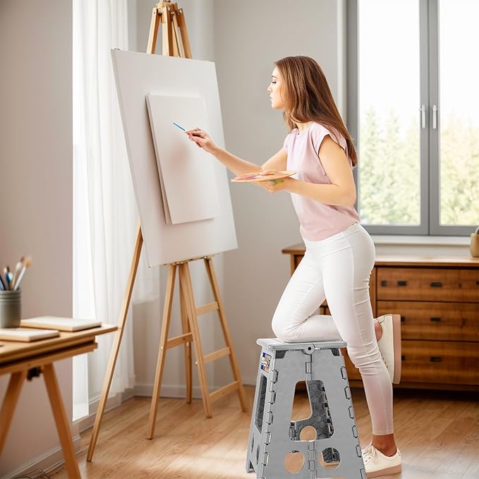 - Safety-Focused Design: Our lightweight folding step stool equipped with a non-slip surface, movable handle and the bottom corners are upgraded to black non-slip dot textured rubber straps to prevent slips and finger traps, improving a secure user experience.