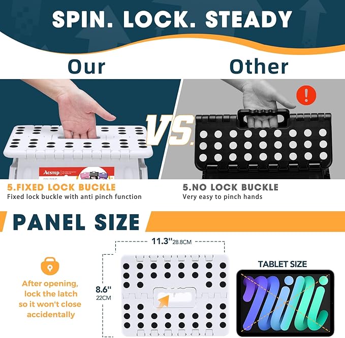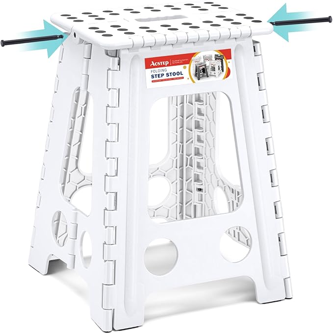 - Space Save Step Stools: ACSTEP foldable stool with handle. Just lift the handle and it will fold up easily and quickly in a few seconds. Lightweight and collapsable, easy to store in corners of bathrooms, kitchens, bedrooms, etc. to keep your home organized, free to go with the slit storage, not occupying space.