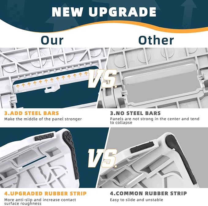 - Non Slip: The special rubber dot textured surface makes the foldable step stool more non-slip, so you don't have to worry about slipping when you stand on it. The bottom corner of the four feet of the stepping stool are upgraded to black non-slip dot textured rubber straps for superb grip , will be more non-slip compared to the original non-slip rubber straps. So it is a perfect companion in the bathroom and kitchen.