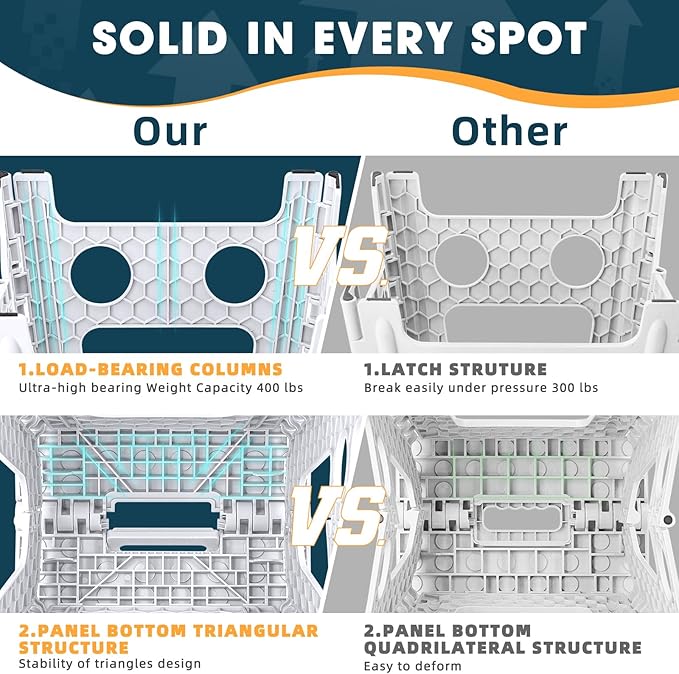 - Loads Up to 400lbs: ACSTEP pin structure stool is patented. Folding step stool has been reinforced with locking pins and fixed hinges to prevent danger of falling off and enhance stability and bearing capacity effectively. Inner honeycomb structure is uniquely designed in such a way that makes the stool extra strong and safe. Tested to hold up to 400 LBS, this folding stool offers great stability even when loaded.