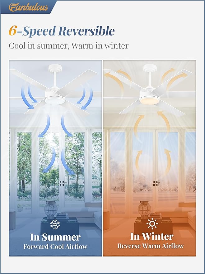 - Reversible DC Motor & 6-Speed:Efficient fan motor allows you to enjoy different feelings in summer and winter.There are 6 different speeds,and our lighting & ceiling fans noise are less than 35dB. The timing function of 1H/4H/8H also brings us convenience