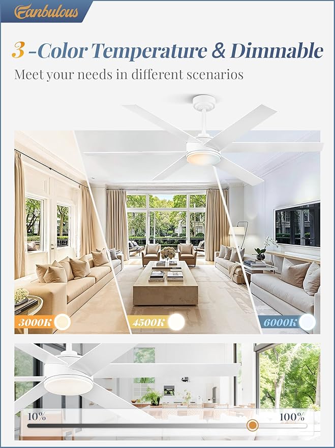 - Stepless Dimmable Light:3 different light temperatures can meet your needs in different occasions and atmospheres (3000/4500/6000k). And our ceiling fans with lights and remote can also achieve 10%-100% dimming function