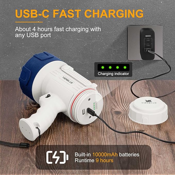 - FOUR HOURS FAST CHARGING: With advanced USB-C charging technology, recharge in just 4 hours. Compatible with any USB charging port, you can charge this rechargeable spotlight at home or in your car.(charging adapter is not included).