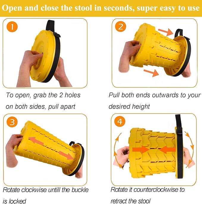 - [Easy to Use, Multipurpose]: Super easy to use. You can open the collapsible stool by holding both ends and pulling to open with slight turning them, perfect for indoors and outdoors. Indoor occasions such as the living room, bedroom, bathroom, kitchen, office. Outdoor activities: drawing room, garden, hiking, BBQ, camping, queue, fishing, etc