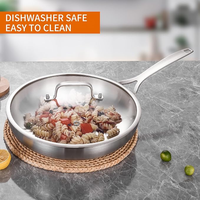 - 【Practical and Elegance】Delarlo Tri-Ply Stainless Steel Pan Combines Ergonomic cookware Design and superior features for optimal cooking performance. The rounded and encapsulated rim for drip free pouring and easy transfers,Rivet-free surface to eliminate food traps