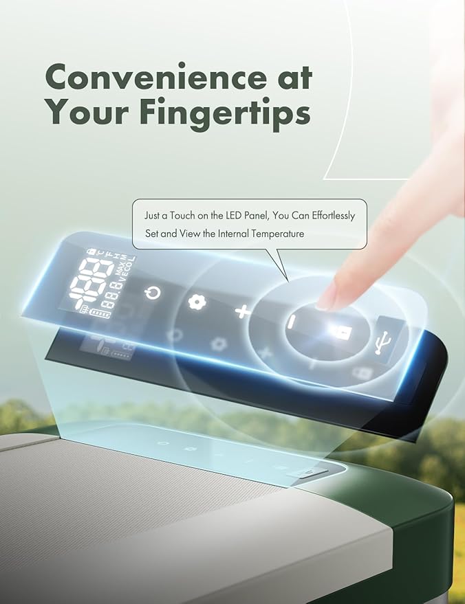 - [LED Panel and USB Charging Port]: The A-Premium portable fridge features an easy-to-use, responsive touchscreen control panel. After stopping the adjustment of the refrigerator's temperature setting for 4 seconds, the display will accurately show the internal temperature, that allows you to precisely set and monitor the internal temperature, adjust modes without hassle.