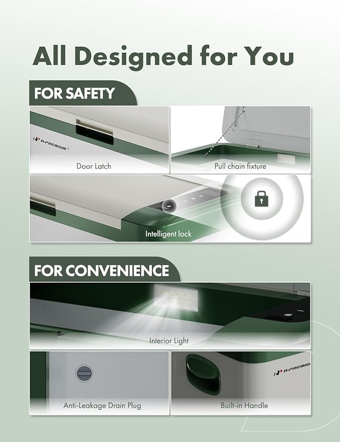 - [LED Panel and USB Charging Port]: The A-Premium portable fridge features an easy-to-use, responsive touchscreen control panel. After stopping the adjustment of the refrigerator's temperature setting for 4 seconds, the display will accurately show the internal temperature, that allows you to precisely set and monitor the internal temperature, adjust modes without hassle.