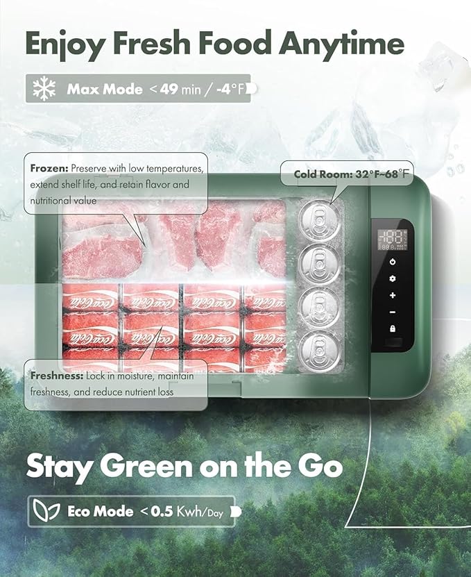 - [Fast Cooling & Two Modes]: The MAX & ECO modes in A-Premium portable fridge can be adjusted as you need. In MAX mode, the refrigerator's high-efficiency compressor can lower the temperature to minus 4°F in approximately 49 minutes, perfect for when you need to freeze items quickly. In ECO mode, the portable refrigerator reduces its operational power consumption to under 0.5 Kwh/Day.