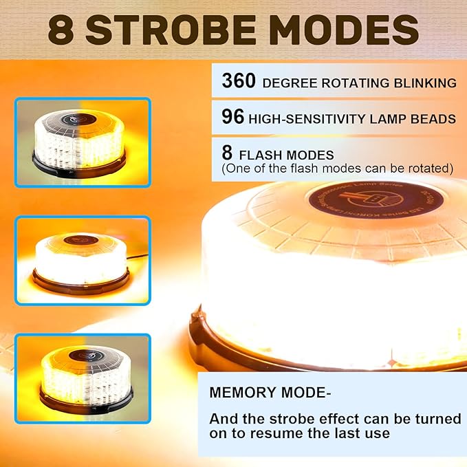 - 【8 Flash Modes】This rooftop strobe lights has 8 unique flashing modes, including 3 full flash modes, 3 left and right strobe modes and 2 rotating modes, which can meet your many needs. The beacon lights for trucks has the function of rotating beacon light, safe and eye-catching, improve the driving safety factor.