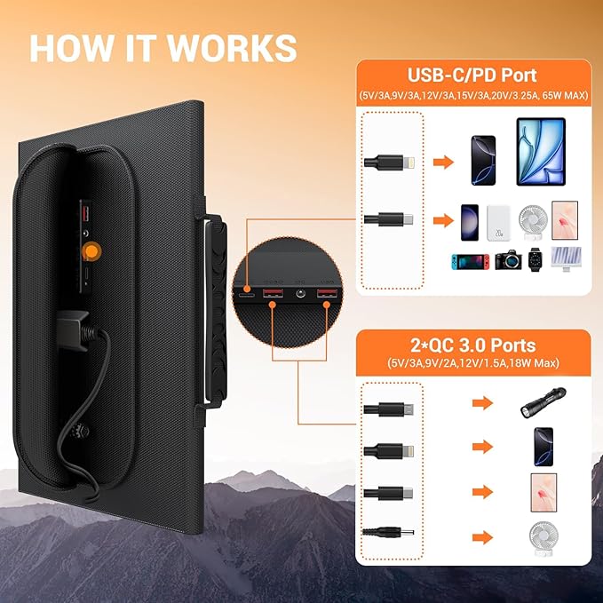 - SAFETY AND WARRANTY: The portable solar panel‘s built-in smart protection system prevents the device from overcharging, overheating, or overloading, ensuring a long service life.