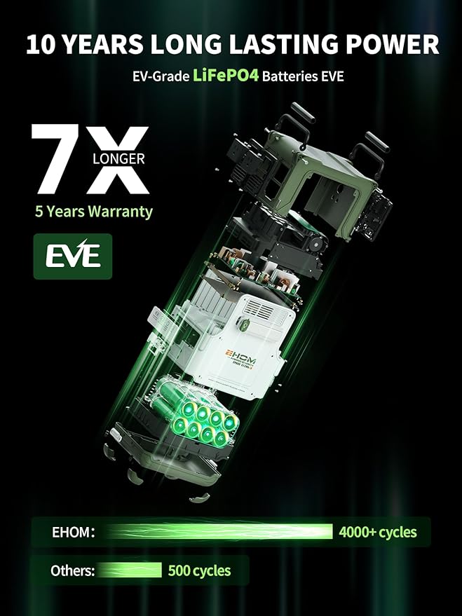 - 【Climate Neutral & BMS Security System】EHOM power storage is equipped with an improved LiFePO4 battery. Use clean, green renewable energies, without fuel or gasoline, smoke-free and low noise (≤ 35dB)! Intelligent, safe and effective safety management for BMS systems with multiple protection devices such as overcharge, overdischarge, overcurrent, overtemperature, overvoltage, overload and short circuit to provide you with a safe usage experience *≤35dB: Measured at a distance of approximately 50cm under the condition of 50% product load (300W)