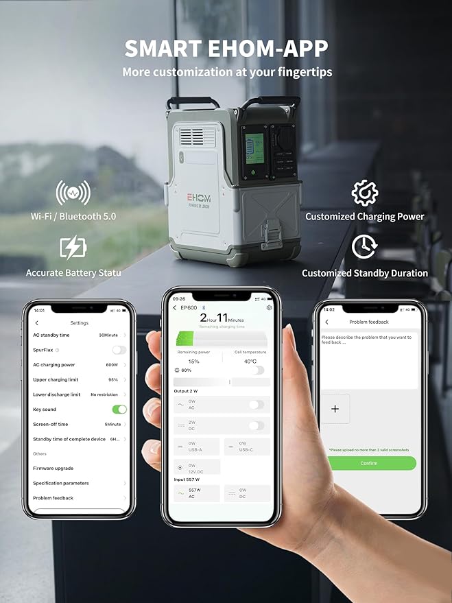 - 【Widely Used & Durable】Whether at home or camping or as a backup power source, the EHOM EP600 portable powerstation meets your power needs, IPX3 waterproof, 1.2 m drop protection, with storage box and has a long lifespan, can charge and discharge up to 3500 life cycles, is easy to use and easy to store, and is ideal for home or travel *The cycle life of 3500 times means that after the battery is fully charged and discharged 3500 times, the remaining capacity is still more than 80%