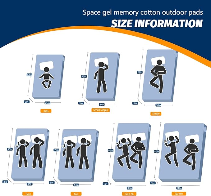 - 【MULTI-SIZE OPTIONAL & AFTER-SALES SERVICE WITHIN 24 HOURS】 5 sizes for you to choose from camping mattress full size, kids (63x26x3") small single (72x24x3”) single (75x30x3”) twin (75x38x3”) twin xl size (80x38x3”), Be sure to choose the most suitable size. Since we shipped by vacuum compression packaging, please Open the package and place it for about 24-48hours. If you have any question, feel free to contact us. Please believe that we will solve the problem for you within 24 hours.