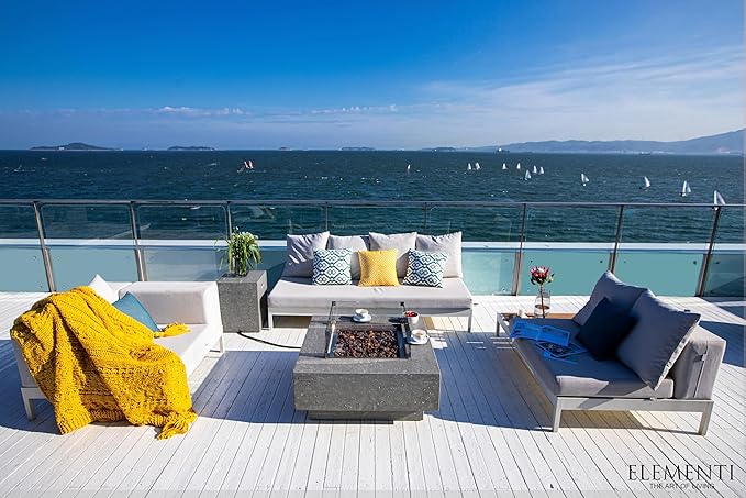 - 【Heavy Duty Outdoor Fire Pit】ELEMENTI Gas patio heater the body construction is Handcrafted glass-fiber reinforced concrete. The table is durable and finished to have a high resistance to heat. Whole body is LIGHT GREY color Brighten up your quality of life with a backyard fire pit as your outdoor centerpiece that will have the reflections of dancing flames keeping you and your loved ones warm and cozy