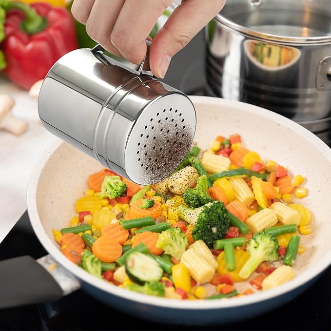 Accmor 2pcs Stainless Steel Dredge, Salt Pepper Dredge Shakers with Handle, Seasonings Spice Shakers with Lid, 10 Ounce
