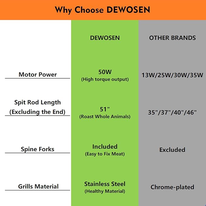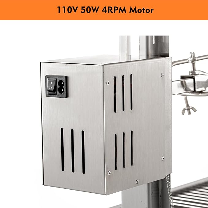 - Powerful Rotisserie Motor: The rotisserie kit comes with a 50W electric motor. The motor outputs strong torque and automatically spin at a speed of approximately 4 RPM. This speed helps you to get saucy, tender and flavor-enhanced meat instead of greasy roasts.