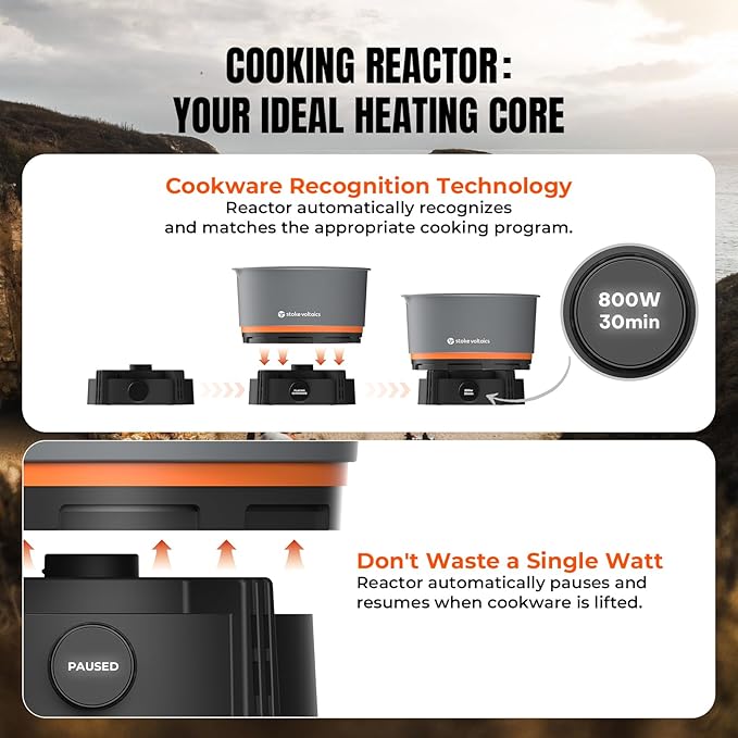 - Versatile Power Source Compatibility: Nomad cooking reactor is a cookeware with five power levels from 200W to 1000W that seamlessly integrates with car inverters, fuel generators, portable power stations and RV power sources, making it the ultimate outdoor electricity cooking solution for Car Camping,RV,EV,Overlanding and Vanlife