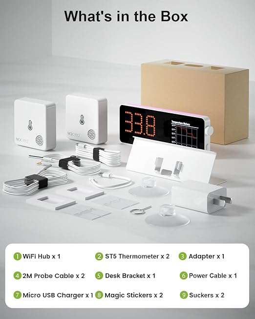 - Included Components : WiFi Hub, 2 Wireless Thermometers, 2 Clips, Adapter, Power Cable, USB Charger