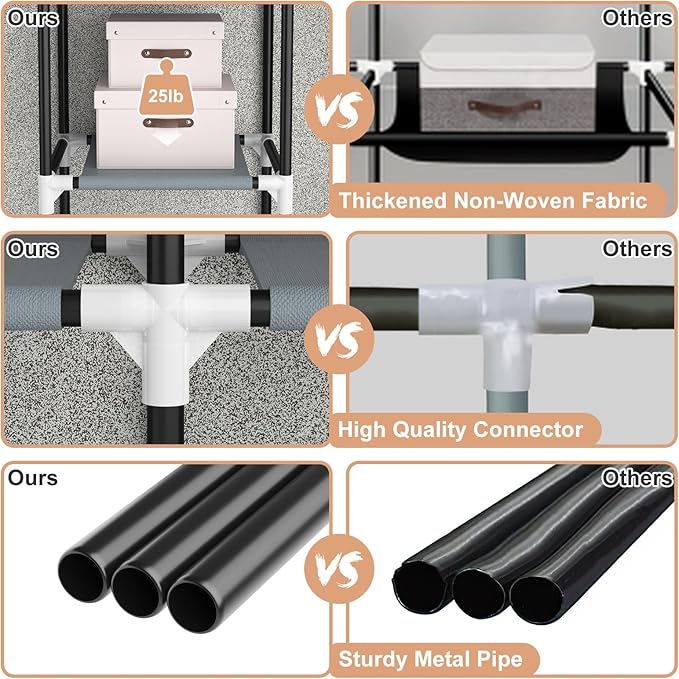 - [Easy to Assemble] The portable closet wardrobe is equipped with a detailed installation instruction manual, just follow the steps of the instruction manual to assemble, and it can be done easily. In addition, we have made an installation video on the page for your reference to help you install faster. NOTE: Make sure all the rods reach the bottom of the plastic connector holes.