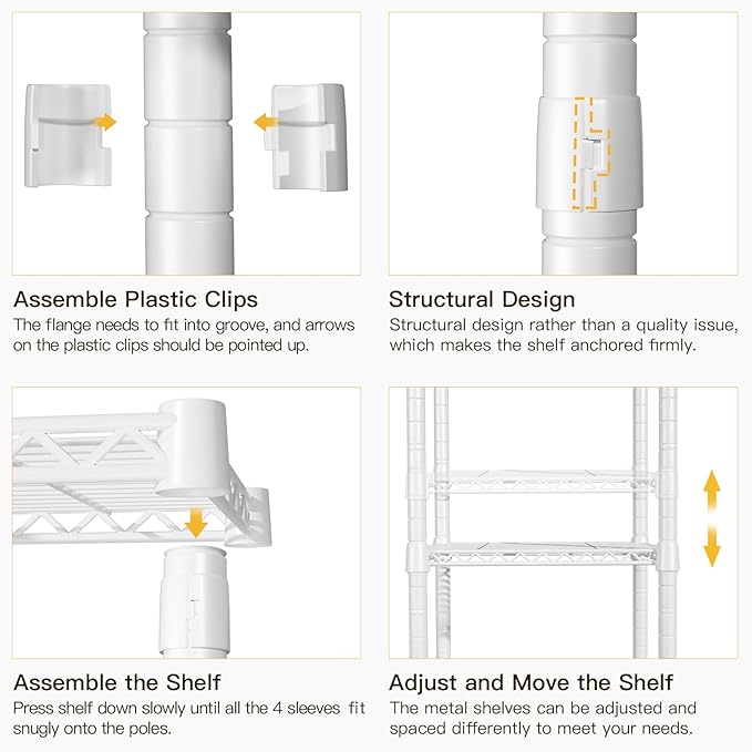 - [Adjustable & Safety Lock]: The shelves and leveling feet are adjustable, moving the wire shelves position can divide the storage space freely. The leveling feet are used to suit the uneven floor