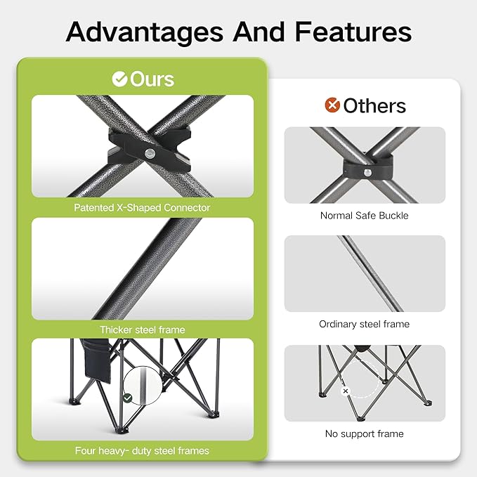 - 【CAMPING CHAIR With Premium 600D OXFORD FABRIC】 The lawn chair with ergonomic padded back, seat and armrest provide max comfort for your body. The durable double-layer 600D padded breathable oxford fabric with powder-coated steel tube frame enables you deserve a comfortable and safe chair.