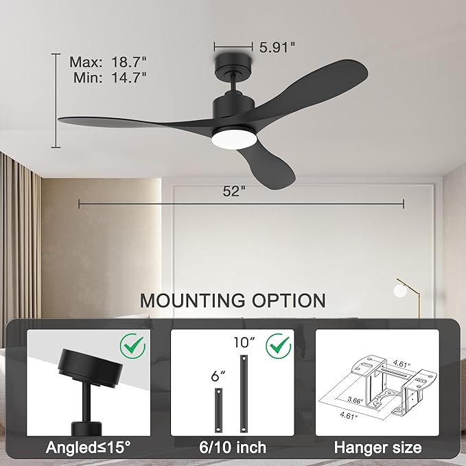 - 【Indoor Outdoor Dual Mount】 Damp-rated black smart ceiling fan suitable for indoor and covered outdoor areas.Smart outdoor ceiling fans for patios, porch, gazebo. Height adjustable with short 6” rod and long 10” rod, for low/high profile, flush/slanted mounting
