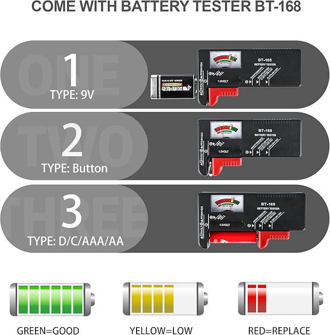 - 🌟【Please Note】BATTERIES NOT INCLUDED.Included a battery tester is suitable for all types of batteries with the organizer but Does NOT include any batteries. Super convenient for you to distinguish which batteries need to be recycled.