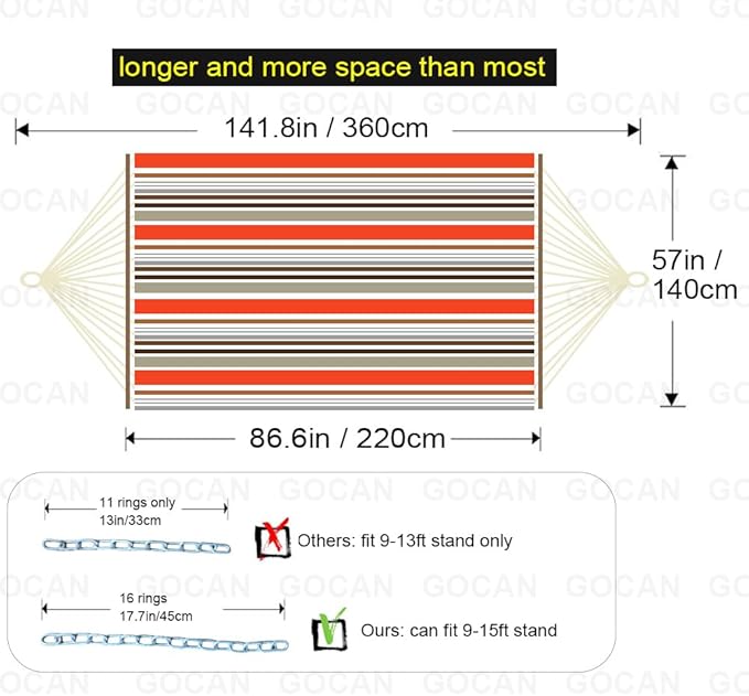 - ☀ LARGER AND LONGER: The quilted fabric hammock can fit stands from 12' to 15'. from loop to loop the length is 141.73",Plus 2 x 18.89" chains and 2 x S-hooks.It was very easy to install. The size is very nice, 2 people can fit very easily. It suits your garden very well.