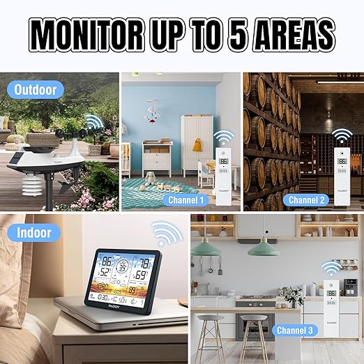- Expandable Monitoring: Connect up to three additional remote sensors (model name R5) to expand your monitoring capabilities. With this flexibility, you can keep tabs on up to five different areas, whether it's your baby's room, garden, living room, kitchen, or elsewhere. Stay informed about various microclimates around your home.