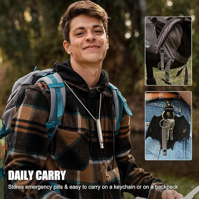- 【Practical & Portable】This titanium alloy whistles combines a 120+ decibel sound with a hidden compartment for your crucial medications, ensuring both safety and convenience. It’s designed for effortless portability; at a mere 21.3g, whether clipped to your key chain or worn around your neck like a piece of jewelry, integrating seamlessly into your gear without adding bulk