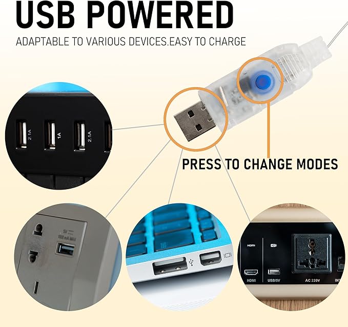 - Safe and Waterproof: Powered by USB, these fairy lights are designed to be safe and energy-efficient, preventing overheating. Compact and lightweight, they come with a reel to prevent tangling and unraveling of the copper wire. Additionally, the lights have an IP44 waterproof rating for convenient outdoor use.
