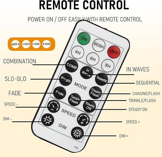 - Remote Control: Easily manage your lights with the included remote control, which allows you to turn the lights on and off, adjust brightness and speed, set 4H, 6H, and 8H timers, and change different lighting modes such as combination, slow glow, wave, sequential, chasing/flash, slow fade, twinkle/flash, and steady on.